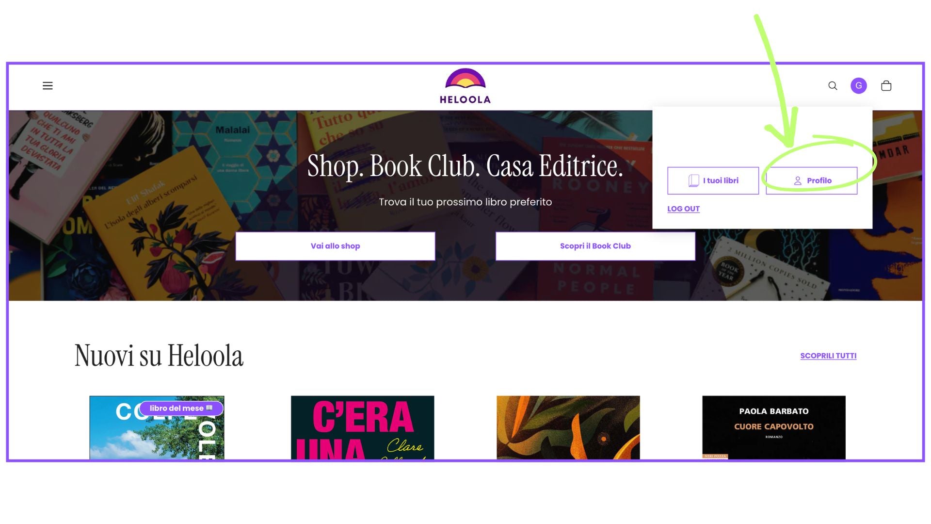 Dal sito di Heloola, clicca l'icona del tuo profilo (in alto a destra) e poi sul tasto "Profilo".