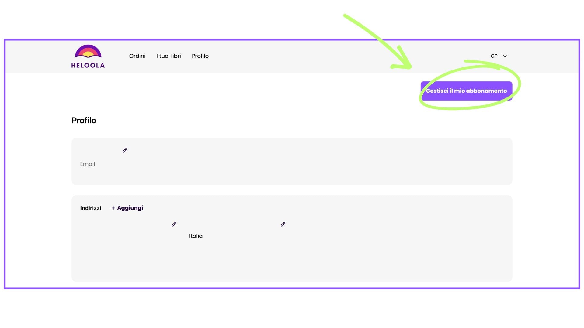 Nella schermata Profilo, clicca sul bottone "Gestisci il mio abbonamento" in alto a destra. Verrai così indirizzat* ad una schermata di recap del tuo abbonamento.