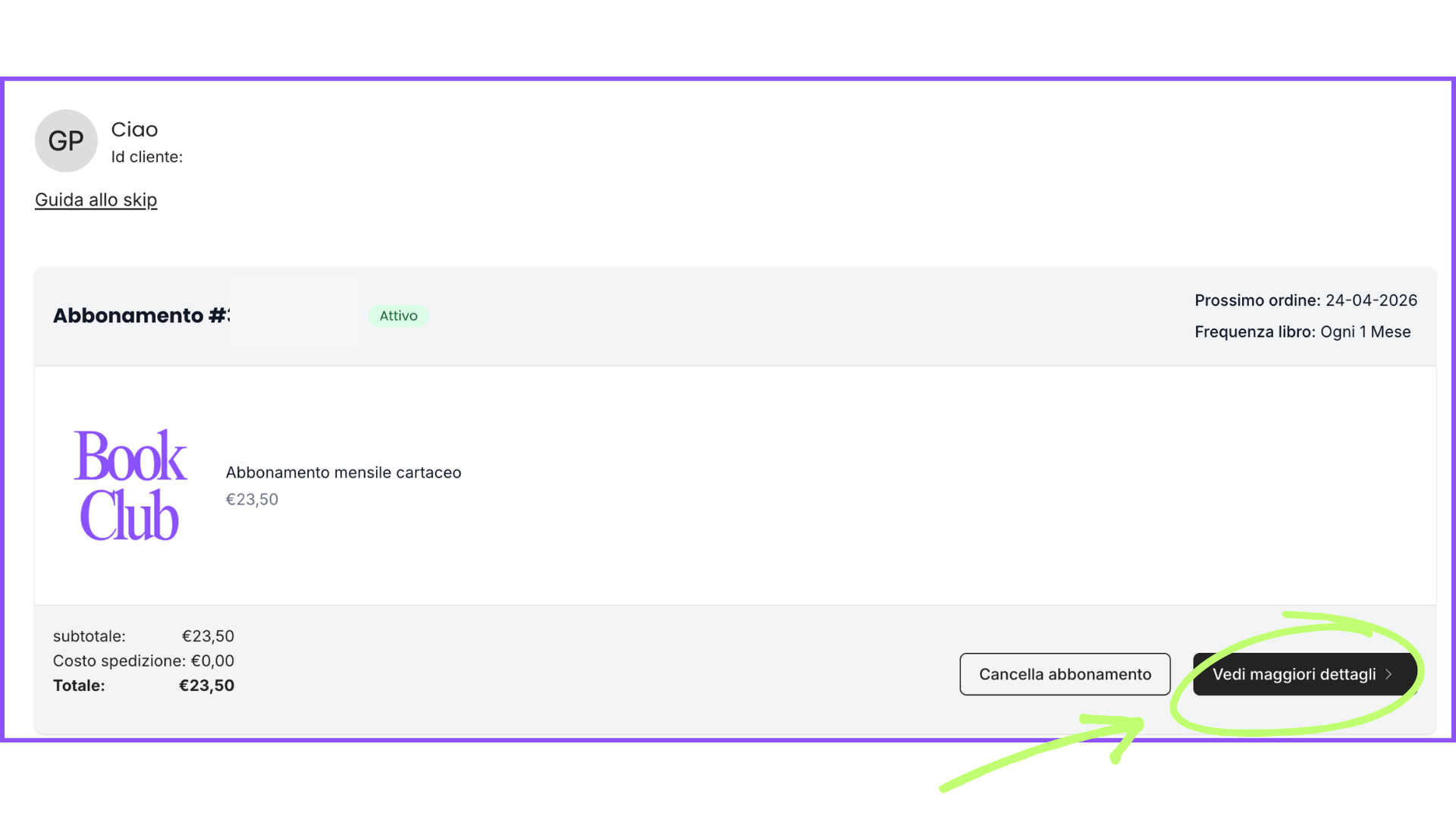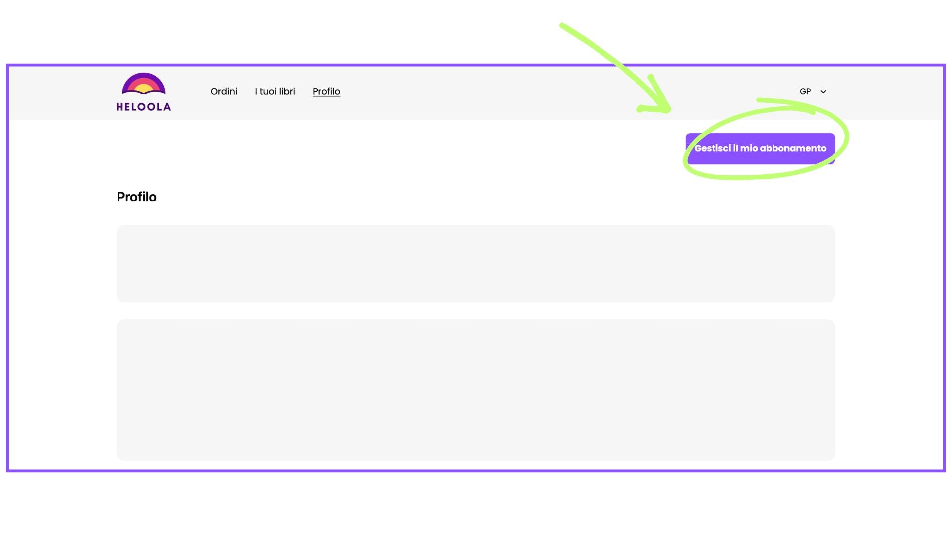 Nella schermata Profilo, clicca sul bottone "Gestisci il mio abbonamento" in alto a destra. Verrai così indirizzat* ad una schermata di recap del tuo abbonamento.